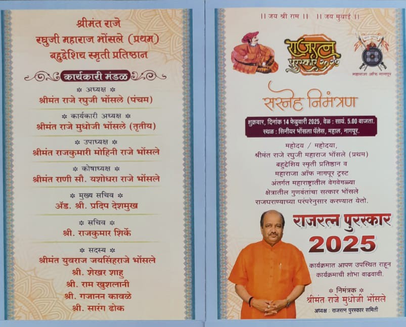 श्रीमंत राजे रघुजी महाराज भोसले (प्रथम) बहुउद्देशीय स्मारक प्रतिष्ठान आणि महाराजा ऑफ नागपूर ट्रस्ट तर्फे महाराष्ट्रातील विविध क्षेत्रात काम करणाऱ्या प्रतिष्ठित व्यक्तींची निवड केली होती. आणि त्यांना “राजरत्न पुरस्कार” देऊन १४ फेब्रुवारी ला, राजरत्न पुरस्काराने सन्मानित केले जाणार. सर्व स्तरावरून पूर्ण पाठिंबा दिल्यामुळे विविध क्षेत्रात काम करणाऱ्या लोकांच्या अनेक नोंदी आमच्या आस्थापनेपर्यंत पोहोचल्या. संस्थेने ठरवलेल्या मानकांच्या आधारे, १४ फेब्रुवारी रोजी समिती कडून ६ व्यक्ती आणि १८ वर्षाखालील २ मुलांना सन्मानित केले जाईल. राजरत्न पुरस्कार शुक्रवारी सायंकाळी ५ वाजता. सिनीयर भोसला पॅलेस महाल नागपूर येथे सन्मानित होण्यासाठी महाराष्ट्रातील पत्रकारिता / माध्यम क्षेत्रातील त्यांच्या उत्कृष्ट कार्याबद्दल आमच्या संस्थेकडून प्रवीण लोणकर (नागपूरमधील परिसर) यांना साहित्य आणि इतिहास क्षेत्रातील उल्लेखनीय योगदानाबद्दल श्रीमंत राजे रघुजी महाराज भोसले (प्रथम) स्मृती पुरस्काराने सन्मानित केले जाईल. पांडुरंग बलकवडे (पुणे) यांना श्रीमंत राजे मुधोजी महाराज उर्फ अप्पासाहेब भोसले (द्वितीय) स्मृती पुरस्कार, पद्मश्री मुरलीकांत राजाराम पेटकर (सांगली) यांना क्रीडा क्षेत्रातील उल्लेखनीय कार्याबद्दल श्रीमंत राजे बहादूर रघुजी महाराज भोसले (चौथा) स्मृती पुरस्कार, पत्रकारिता क्षेत्रातील छायाचित्रकार आणि कॅमेरामन म्हणून उत्कृष्ट कामगिरीबद्दल वरदराज भोसले (कोल्हापूर) यांना श्रीमंत राजे बहादूर फत्तेसिंग महाराज भोसले स्मृती पुरस्काराने सन्मानित केले जाईल. सुरेश उर्फ छोटू वैतागे (नागपूर) यांना विशेष कार्यासाठी श्रीमंत राजे खंडोजी महाराज भोसले उर्फ चिमणाबापू स्मृती पुरस्काराने सन्मानित केले जाणार आहेत. रुपकिशोर कनोजिया (नागपूर) यांना श्रीमंत राजे बहादूर अजितसिंग महाराज भोसले स्मृती पुरस्काराने सन्मानित केले जाईल. त्याचप्रमाणे, १८ वर्षांखालील मुलांच्या क्रीडा क्षेत्रात, कु.तन्वी सुखदेव धुर्वे (नागपूर) यांना श्रीमंत छत्रपती संभाजी महाराज भोसले स्मृती पुरस्काराने सन्मानित केले जाईल. विशेष कामासाठी मल्हार अमित महाडिक (नागपूर) यांना श्रीमंत महाराणा प्रताप स्मृती पुरस्काराने सन्मानित करण्याचा निर्णय घेण्यात आला आहे. यावेळी कार्यक्रमाचे अध्यक्ष पी.पी.आचार्य स्वामी श्री. जितेंद्रनाथ महाराज (श्रीनाथ पीठाधीश्वर, श्री देवनाथ मठ, सुर्जी अंजनगाव, जिल्हा अमरावती), कार्यक्रमाचे उद्घाटन अ‍ॅड. आशिष शेलार (विज्ञान आणि तंत्रज्ञान, सांस्कृतिक कार्य मंत्री, महाराष्ट्र राज्य), कार्यक्रमाचे प्रमुख पाहुणे अ‍ॅड अभिजित वंजारी आणि प्रमुख उपस्थिती श्री