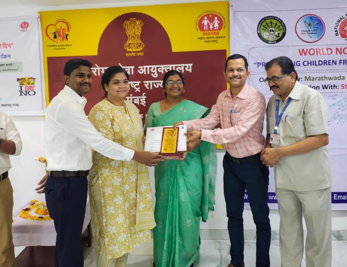 चंद्रपूर, दि. 31 : राष्ट्रीय तंबाखु नियंत्रण कार्यक्रमात चंद्रपूर जिल्ह्याने महाराष्ट्रात तिसरा क्रमांक पटकाविला आहे. याबाबत 29 मे 2024 रोजी राज्य तंबाखु नियंत्रण कक्ष, मुंबई येथे झालेल्या बैठकीत जिल्हा सामान्य रुग्णालय येथील सल्लागार डॉ. श्वेता सावलीकर यांचा सत्कार करण्यात आला.