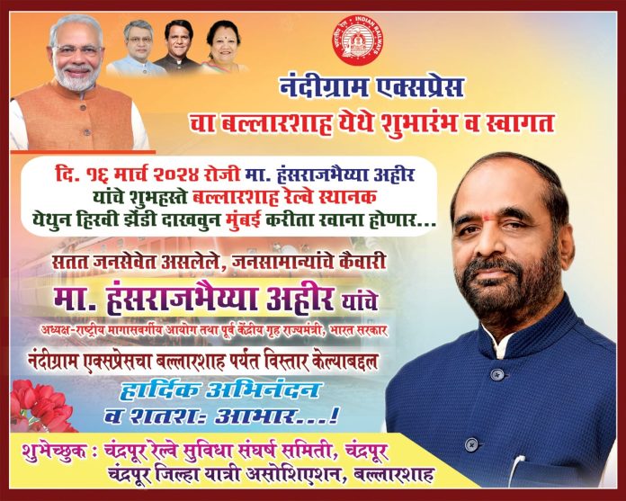 चंद्रपूर /यवतमाळ : राष्ट्रीय मागासवर्गीय आयोगाचे अध्यक्ष तथा पूर्व केंद्रीय गृहराज्यमंत्री हंसराज अहीर यांच्या सतत प्रयत्नामुळे व मा. प्रधानमंत्री नरेंद्र मोदी जी व केंद्रीय रेल्वे मंत्र्यांच्या सहकार्याने ट्रेन नं. 11401/11402 नंदीग्राम एक्सप्रेस(मुंबई-आदिलाबाद) चा विस्तार बल्हारशाह स्थानकापर्यंत करण्यात आला असून ही एक्सप्रेस दि 16 मार्च 2024 रोजी सकाळी 08.30 वा. बल्हारशाह येथून मुंबई करीता रवाना होत असून या गाडीचा शुभारंभ हंसराज अहीर यांचे शुभहस्ते होणार असून ते या गाडीस हिरवी झेंडी दाखवून गाडीस रवाना करणार आहे.